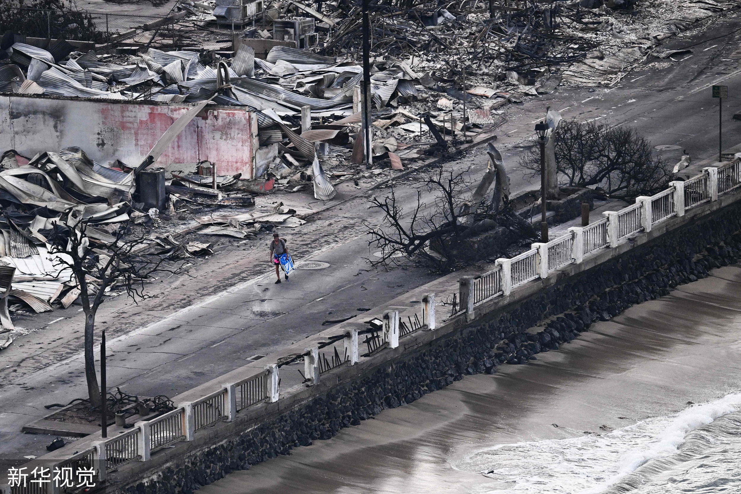 当地时间2023年8月10日,美国夏威夷群岛拉海纳,夏威夷毛伊岛发生火灾,一名行人走过被大火烧毁的建筑物。