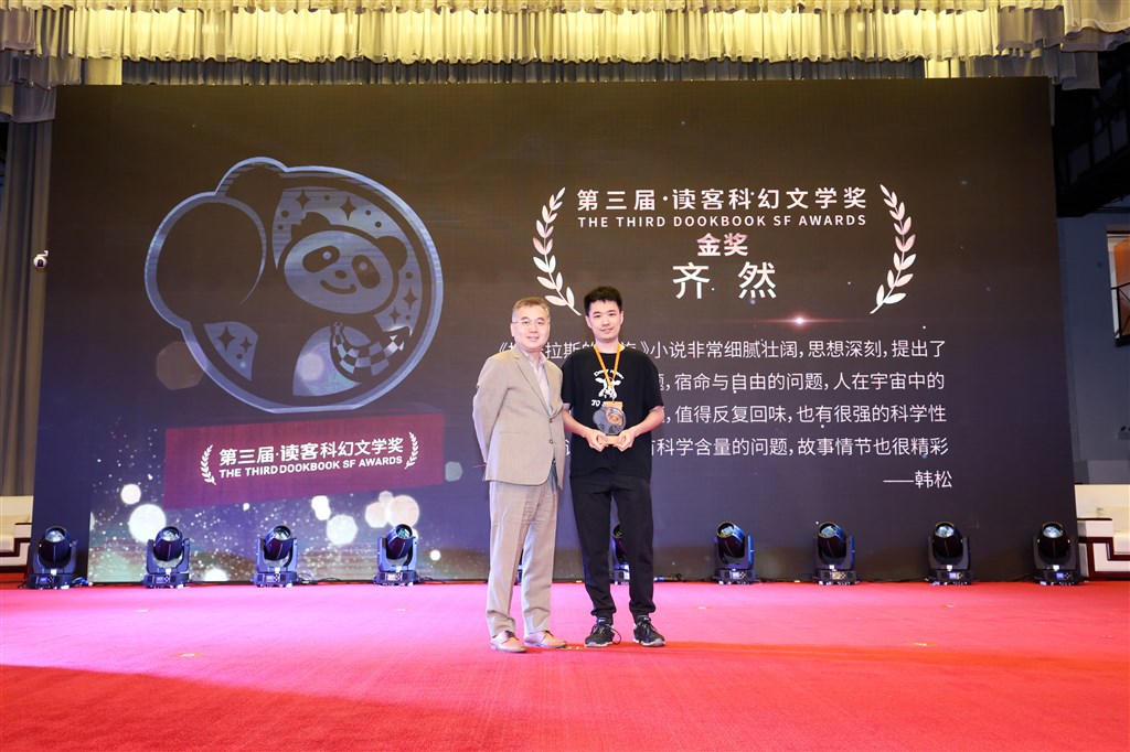 东方网记者包永婷8月20日报道:8月19日,第三届读客科幻文学奖颁奖典礼在上海举行。历经三个月激烈角逐,共产生了34名获奖者,其中齐然的《拉普拉斯的回旋》、菊储的《假如情感能贩卖》以及么瑶的《退回童年》获得金奖。