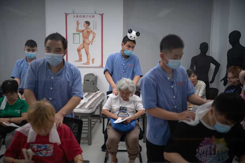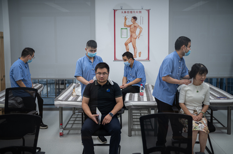 8月28日下午,来自感智盲人按摩•针灸各大门店的按摩技师,在中医按摩实训教室为市民提供公益按摩服务。