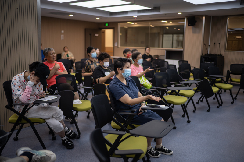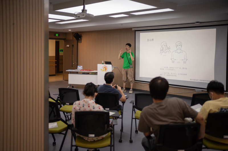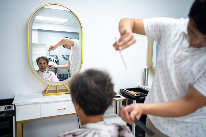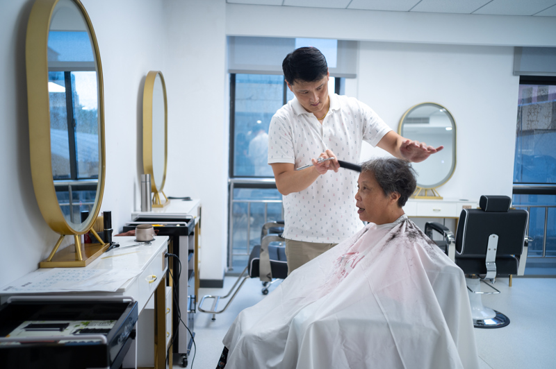 在美发实训教室,获得国家级认证的专业美发师虽然身有听力的障碍,却不影响他与专程来体验的阿姨妈妈们热络地沟通交流,为周边社区提供爱心理发服务。