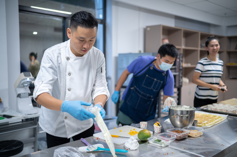 二楼的烘焙教室,聋人烘焙师王东硕和俞游波现场展示水果蛋糕的制作工艺。市民可以获得手把手教授的学习机会,也可以尝到专业烘焙师的手艺。俞游波拥有17年的行业工作经验,曾在多家高级酒店、餐厅担任甜点师。他与合伙人王东硕一起创业,打造自己的烘焙品牌和工坊后,决心回报社会。