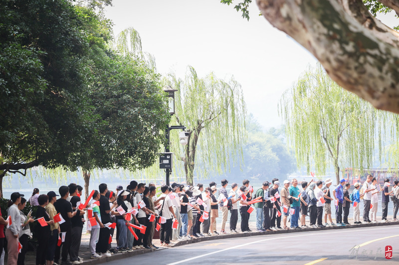 9月8日清晨,杭州市民在西湖边等待火炬传递开始。