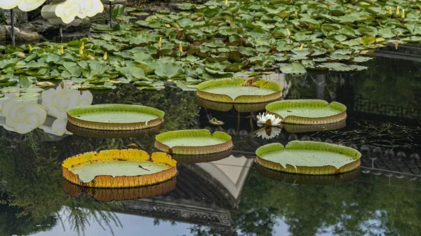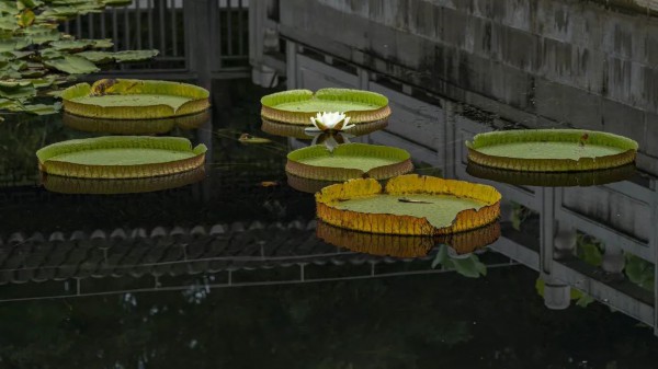 古猗园中王莲花开正当时,浮于水面的莲叶像一只只翠绿色的大圆盘。微风拂过,好一幅诗意画卷。