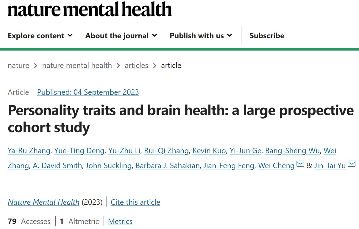 相关研究成果以Personality traits and brain health: a large prospective cohort study(《人格特征与脑健康:一项大规模纵向队列研究》)为题,发表在Nature子刊Nature Mental Health(《自然-精神健康》),并被编辑以“Personality traits linked to risk of brain disorder”(人格特征与脑疾病风险相关)为题,选为Research Briefing(研究简报)进行报道。