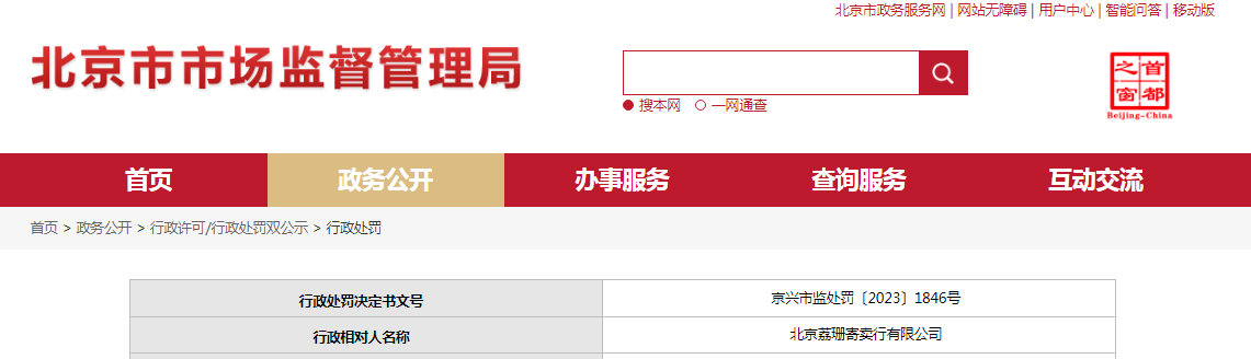 北京市大兴区市场监督管理局对北京荔珊寄卖行有限公司作出行政处罚