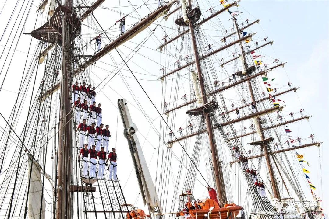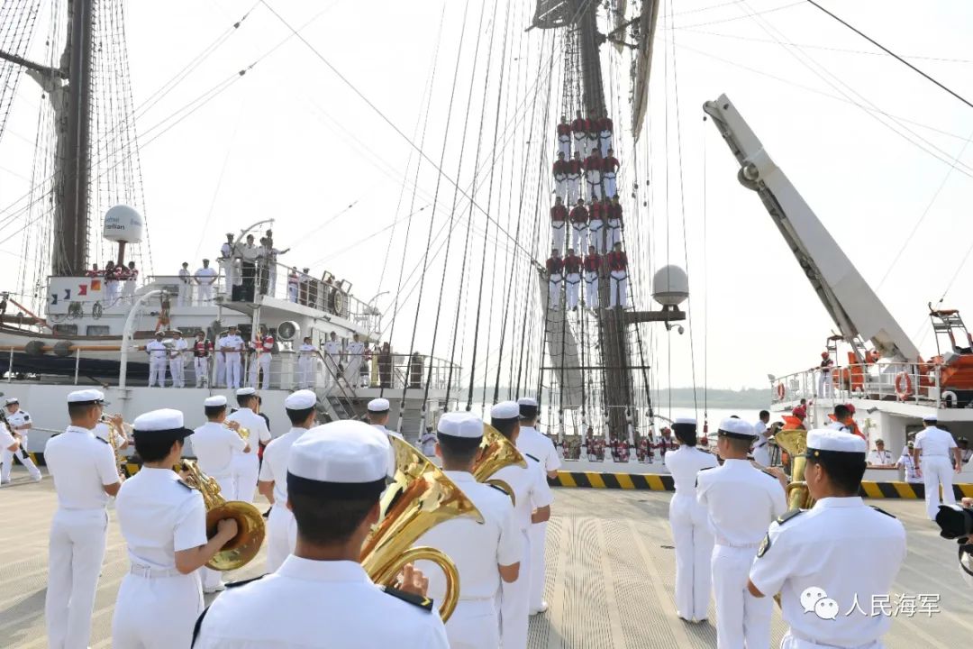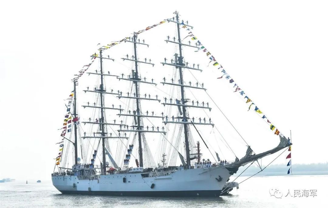 中方官兵列队打出标语欢迎秘鲁“联合”号风帆训练舰访沪