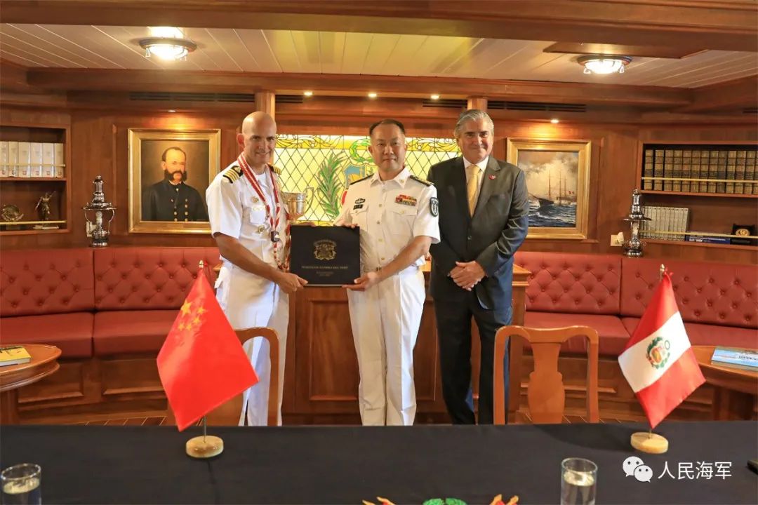 秘方舰长阿尔塞上校与秘鲁驻华大使亲切握手