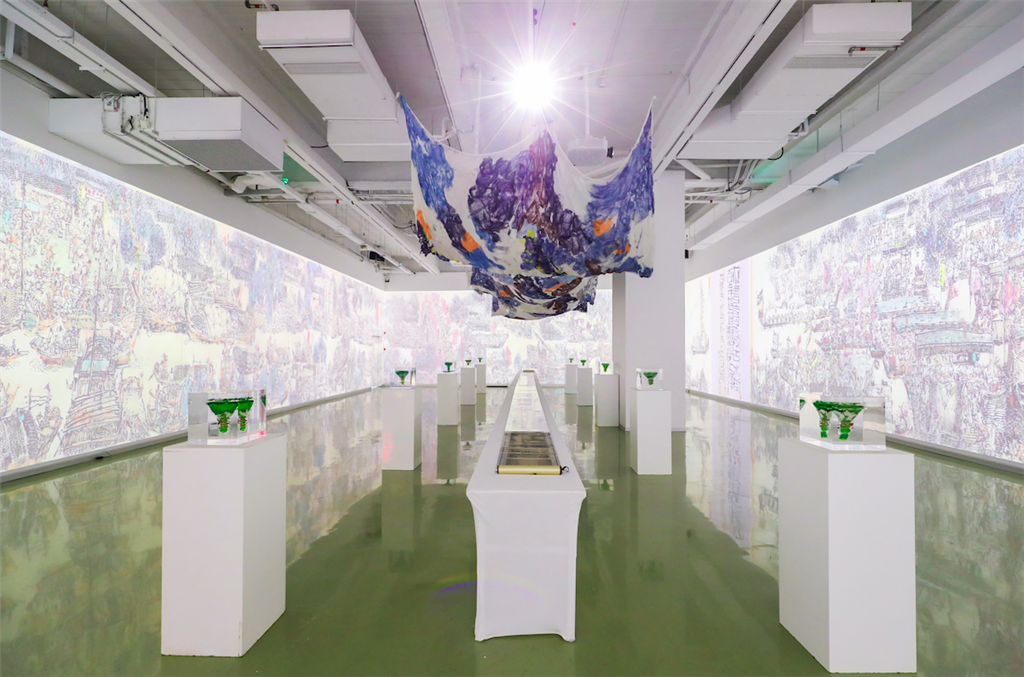 在展览中,“当代达芬奇”朱仁民呼吁用艺术拯救生态。朱仁民带来了他的代表作三十米长卷《大运河》,尤如《清明上河图》之宏伟,既保留康乾年间运河建筑的所有特色,又融合杭州胜利河古水街的当代景观,光影和实物相映成辉,彷佛游走于历史长河之中。