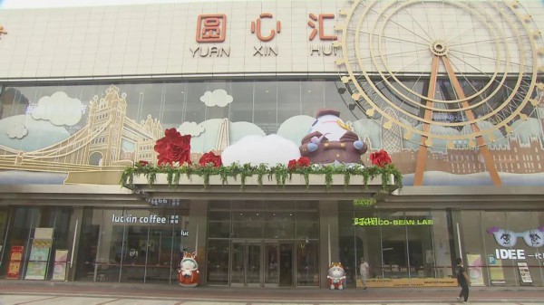 在南桥镇圆心汇商场,门头上装上了玩偶造型、摩天轮造型和红花造型的装饰品,工作人员正在对商场进行布置。