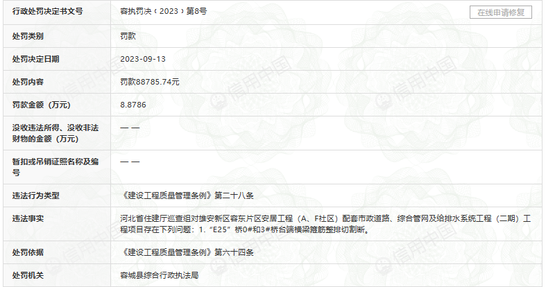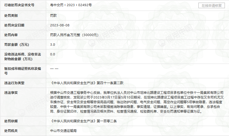 2023年9月13日,中铁十一局集团限公司被容城县综合行政执法局给予罚款人民币88785.74元的行政处罚,违法行为类型为违反《建设工程质量管理条例》第二十八条。2023年8月8日,该公司被中山市交通运输局给予罚款30000元的行政处罚,违法行为类型为违反《中华人民共和国安全生产法》第四十一条第二款。
