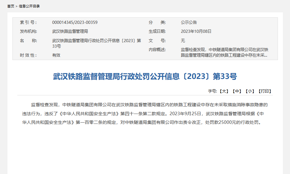 行政处罚公开信息〔2023〕第33号显示,中铁隧道局集团有限公司在武汉铁路监督管理局辖区内的铁路工程建设中存在未采取措施消除事故隐患的违法行为,违反了《中华人民共和国安全生产法》第四十一条第二款规定。2023年9月25日,武汉铁路监督管理局根据《中华人民共和国安全生产法》第一百零二条的规定,对中铁隧道局集团有限公司作出责令改正,处罚款25000元的行政处罚。