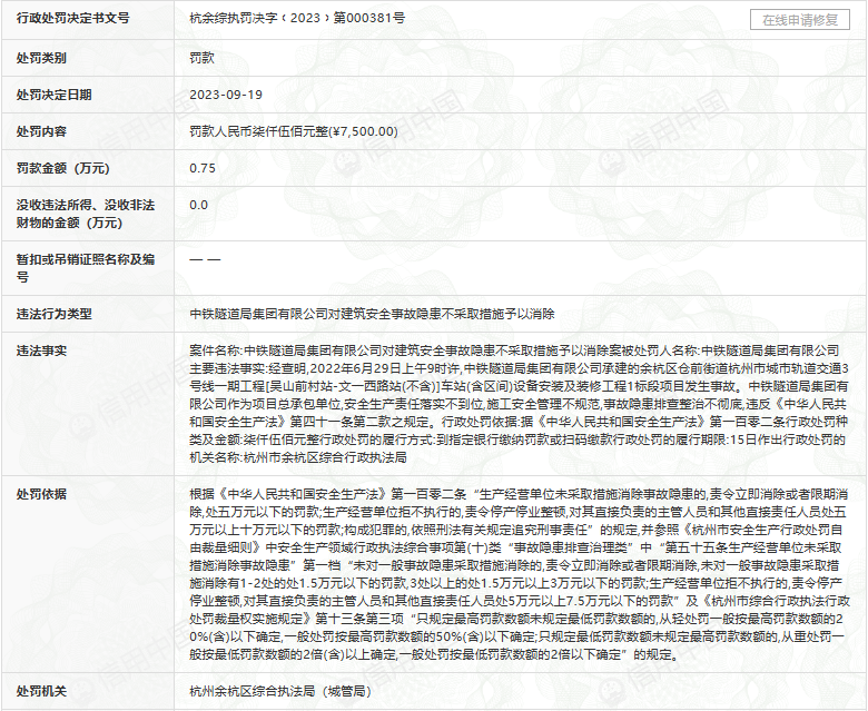 2023年9月19日,中铁隧道局集团有限公司被杭州余杭区综合执法局(城管局)给予罚款7500元的行政处罚,违法行为类型为对建筑安全事故隐患不采取措施予以消除。