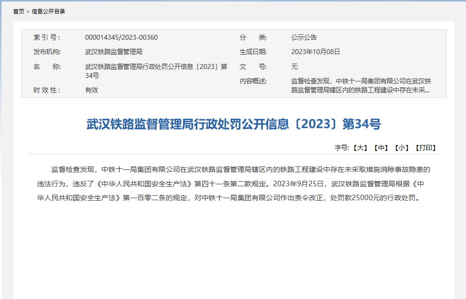 行政处罚公开信息〔2023〕第34号显示,中铁十一局集团有限公司在武汉铁路监督管理局辖区内的铁路工程建设中存在未采取措施消除事故隐患的违法行为,违反了《中华人民共和国安全生产法》第四十一条第二款规定。2023年9月25日,武汉铁路监督管理局根据《中华人民共和国安全生产法》第一百零二条的规定,对中铁十一局集团有限公司作出责令改正,处罚款25000元的行政处罚。
