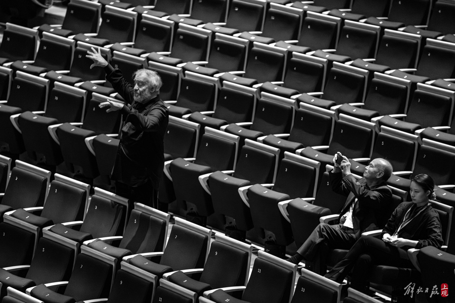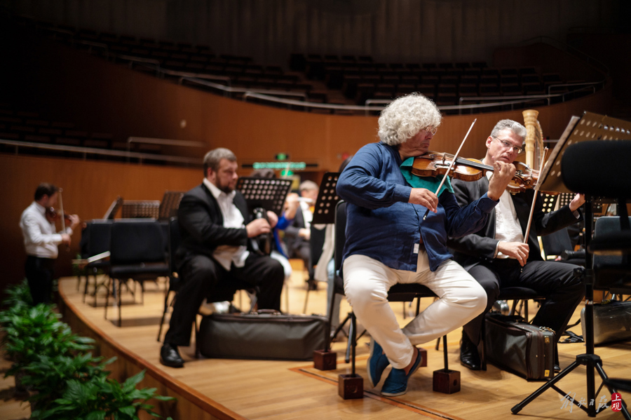 捷杰耶夫走进音乐厅,现场迅速安静了下来。经过和乐队首席的简短交流,排练进入状态。