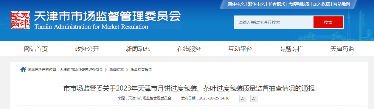 中国质量新闻网讯 10月25日,天津市市场监督管理委员会网站通报2023年天津市月饼过度包装、茶叶过度包装质量监督抽查情况。