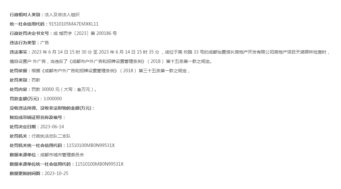 成城罚字〔2023〕第 200186 号显示,违法事实如下:2023年6月14日15时30分至2023年6月14日15时35分,成位于高坎路33号的成都怡置信长房地产开发有限公司房地产项目天湖翠林检查时,擅自设置户外广告,当违反了《成都市户外广告和招牌设置管理条例》(2018)第十五条第一款之规定。处罚依据:根据《成都市户外广告和招牌设置管理条例》(2018)第三十五条第一款之规定,行政执法总队二支队对成都怡置信长房地产开发有限公司罚款30000元(大写:叁万元)。