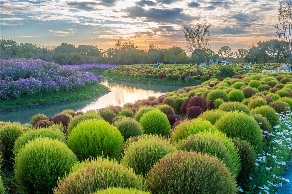 秋高气爽、风景如画的“花开海上”生态园,正值百亩地肤变色期,团团簇簇相拥,青绿赤红交错,美不胜收。日前,园内的格桑花、粉黛乱子草、醉蝶花、硫华菊等各类花卉也相继盛开,斑斓色彩把大地装点得如同打翻了的调色盘。