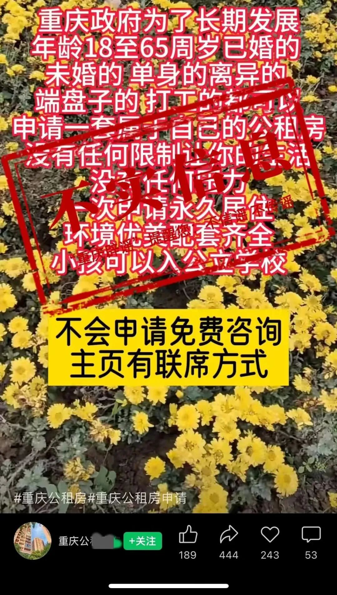 近日,有个别社交账号发布短视频称,“重庆公租房不摇号直接分房”“一次申请永久居住”“永不涨租”,经向重庆市公共租赁房管理局核实,以上均为虚假不实信息。
