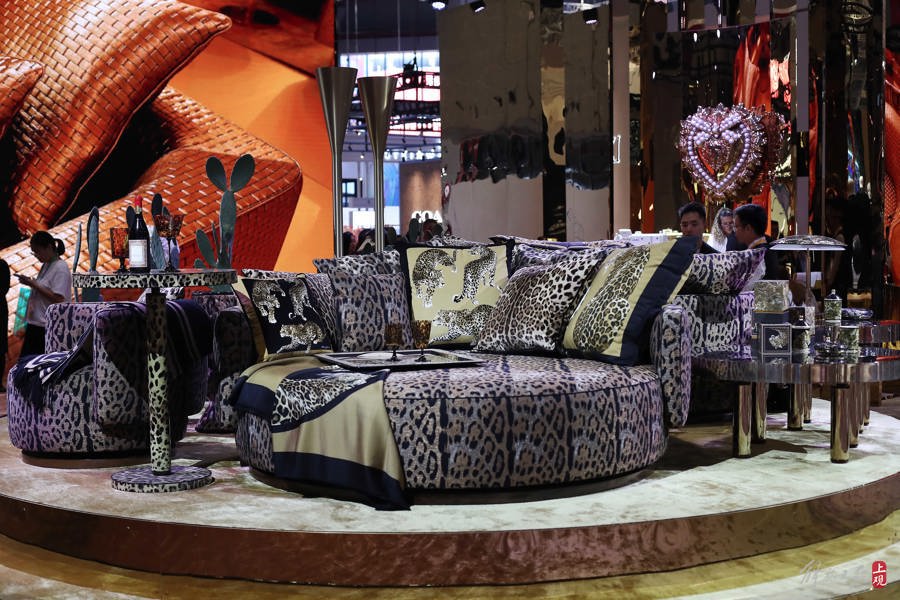杜嘉班纳家居系列(Dolce&Gabbana Casa)陈列于展台中央,涵盖家具及丰富家居配饰,分为豹纹(Leopard)与欧罗奢金(Oro 24K)两大主题:豹纹(Leopard)诠释强烈的个性和永恒的魅力;欧罗奢金(Oro 24K)则是向奢华的巴洛克风格与其光怪绮丽的生动造型致敬。