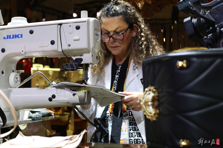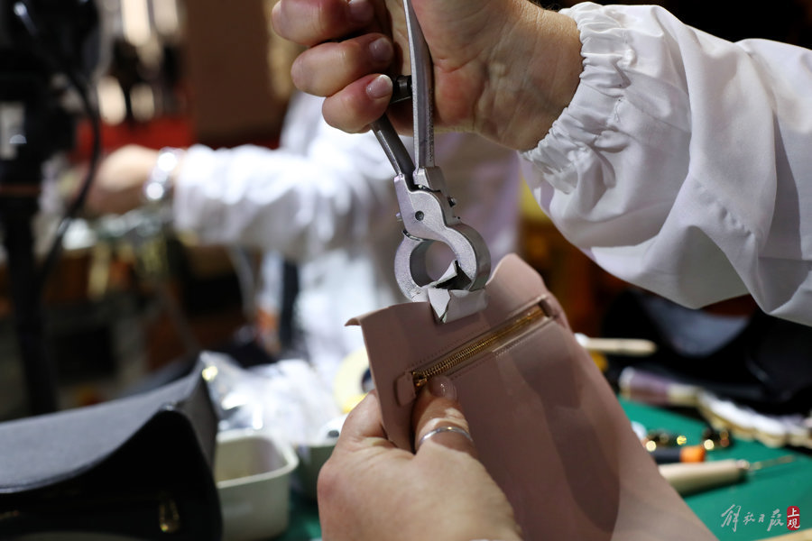 皮具艺匠在现场打造带有“Devotion for CIIE”印记的进博会特别版Devotion手袋。