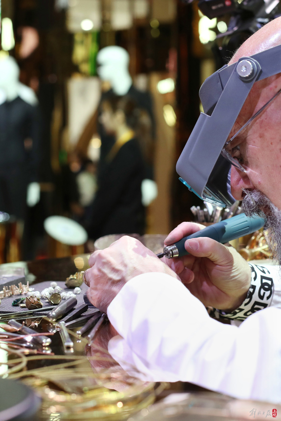 11月7日,意大利金匠维琴佐·维拉蒂一席白色休闲装,坐上杜嘉班纳展台,用金银丝细工、浮雕、凿刻等塑造栩栩如生的金属质感玫瑰,展示其高超的珠宝加工手艺。