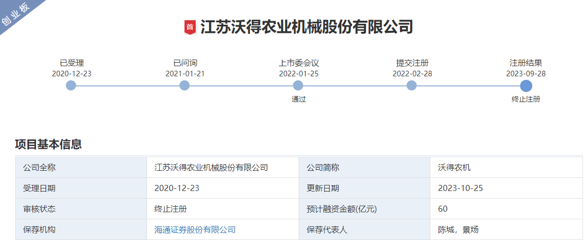 具体而言,沃得农机的创业板IPO于2020年12月23日受理,2021年1月21日问询,2022年1月25日通过了上市委会议,并于2022年2月28日提交注册,但在今年9月28日终止注册。