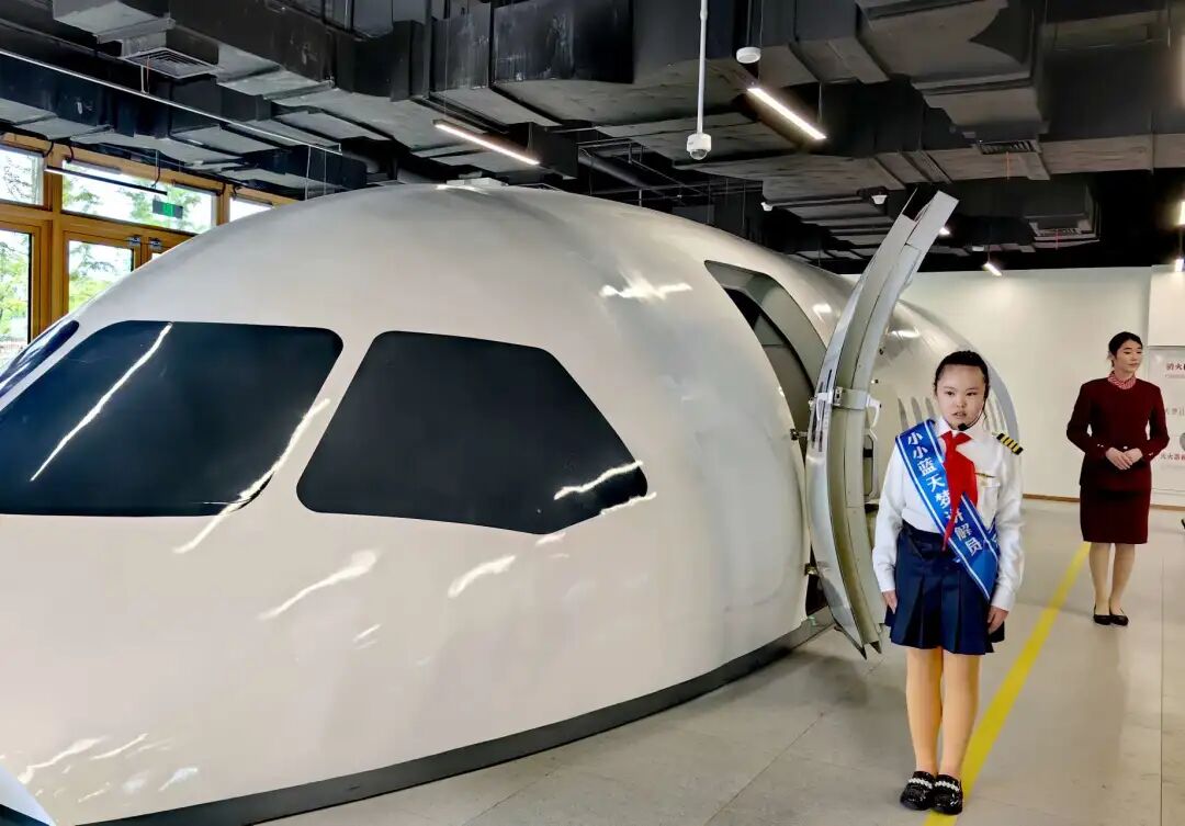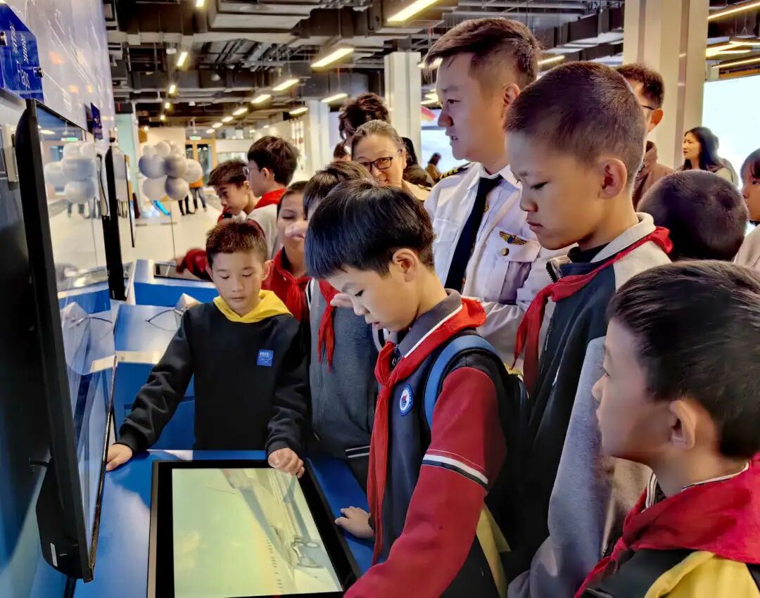 “起飞、拉升、平飞……”在模拟操作驾驶区,C919飞行模拟机上,华东师范大学附属张江实验中学六年级学生刘义正和小伙伴们过了一把当“飞行员”的瘾。在飞行教员的指导下,他们沉浸式体验了驾驶“真飞机”翱翔云端的乐趣。