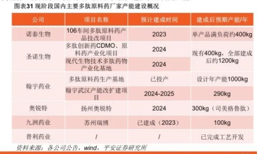 原料药企方面,诺泰生物在2021年的招股书中就提到募资用途包括“106车间多肽原料药产品技改项目”,该项目拟将公司现有闲置的106车间的3、4 层建设成以利拉鲁肽、索玛鲁肽为主的多肽原料药生产车间,提高公司多肽原料药的生产能力。今年8月,翰宇药业公告称,其将以定增的方式募集资金2.54亿元,资金将用于扩充子公司翰宇武汉的产能以及司美格鲁肽的研发项目。