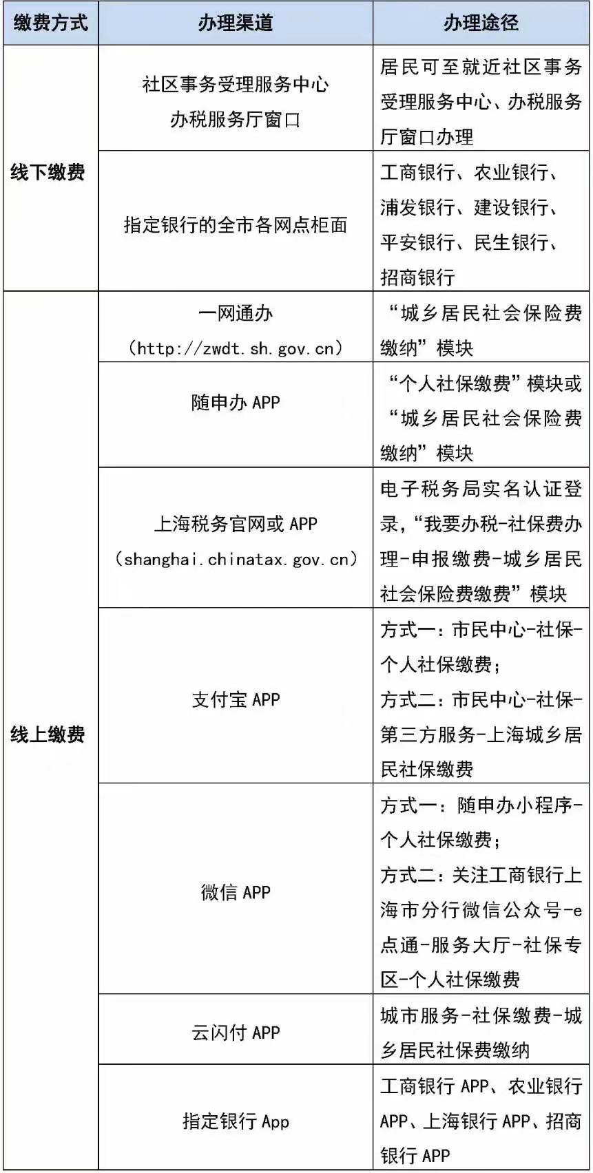符合参保条件的,可就近至社区事务受理服务中心、办税服务厅、指定银行网点现场缴费,也可通过一网通办、随申办、上海税务官网电子税务局、支付宝、微信、云闪付、指定银行等渠道在线缴费。