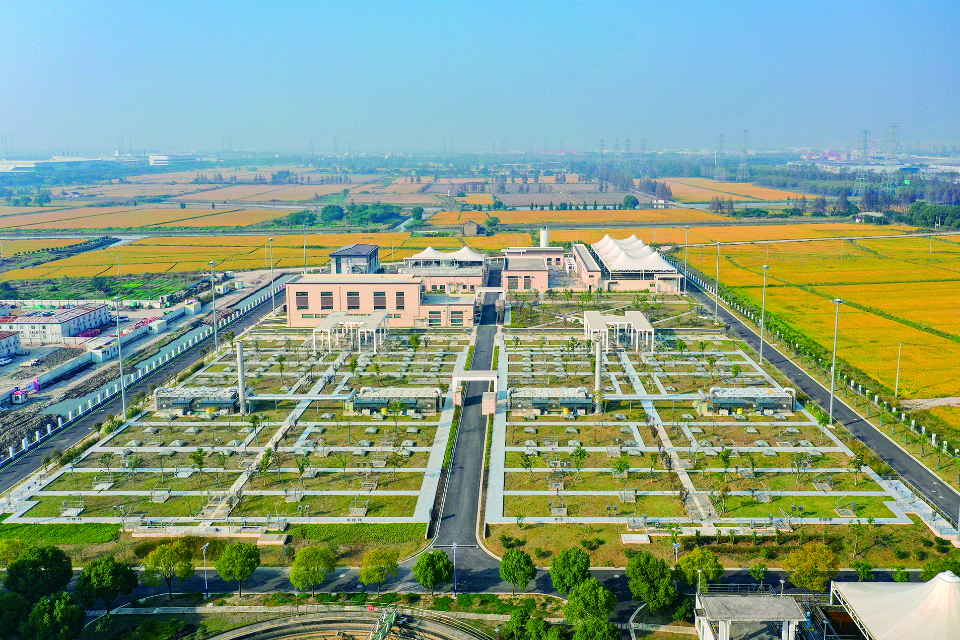 从空中俯瞰,厂区外秋粮遍野金黄,厂区内则绿植茵茵,呈现出一幅和谐共生的生态画卷。三期扩建部分采用了半地下单层加盖的建设形式,比常规地上布局形式节省约2.45万平方米的土地资源。箱体上建设景观绿地,结合海绵城市设计,减少了地表径流并降低径流污染。以往直埋于地下的直径达1400毫米的污水管、直径达300毫米的污泥管及相关配套管线,统一被收纳到地下近10米的构筑物空间内。“三期扩建总占地面积达4.5公顷,较常规地上污水处理构筑物节约了1/3土地。”上海松江西部水环境净化有限公司经理马伟表示,更为重要的是,未来的管养维护也更为便利了。