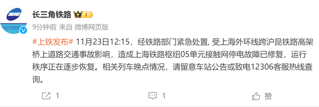 据中国铁路上海局集团有限公司介绍,11月23日12:15,经铁路部门紧急处置, 受上海外环线跨沪昆铁路高架桥上道路交通事故影响,造成上海铁路枢纽05单元接触网停电故障已修复,运行秩序正在逐步恢复。相关列车晚点情况,请留意车站公告或致电12306客服热线查询。