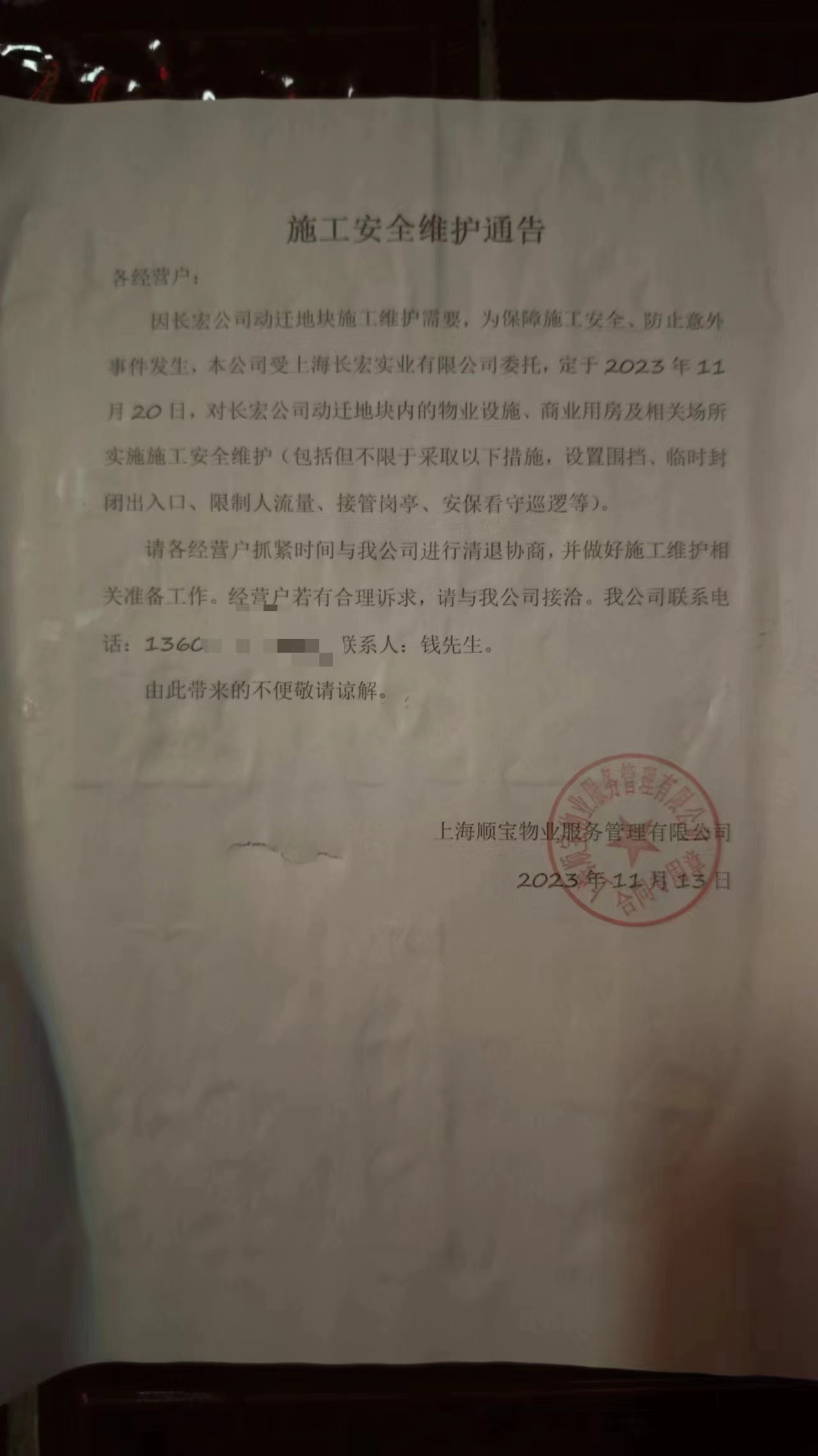 11月24日,记者在世纪联华淞南店近淞发路的围挡上看到的一张《施工安全维护通告》显示,上海顺宝物业服务管理有限公司受上海长宏实业有限公司委托,在11月20日对动迁地块内的物业设施、商业用房及相关场所实施施工安全维护,并请各经营户抓紧时间进行清退协商。