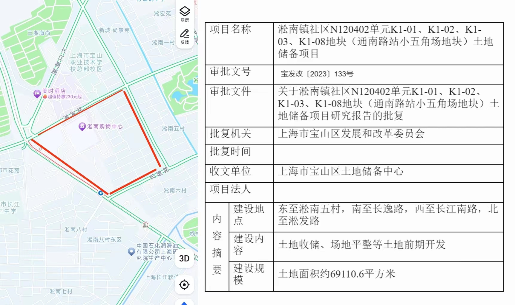 记者从上海市宝山区人民政府网站上查询到,2023年8月21日发布的《关于淞南镇社区N120402单元K1-01、K1-02、K1-03、K1-08地块(通南路站小五角场地块)土地储备项目研究报告的批复》显示,东至淞南五村,南至长逸路,西至长江南路,北至淞发路的地块,即世纪联华所处的“小五角场”地块将进行土地收储、场地平整等土地前期开发工作。