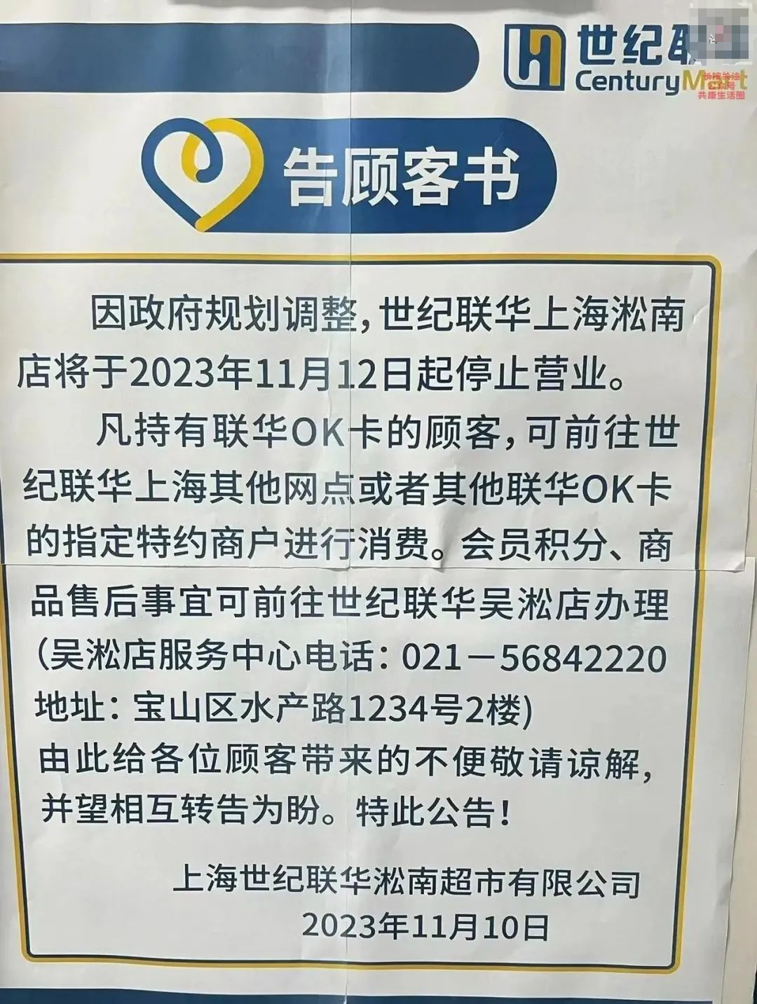 世纪联华上海淞南店告顾客书。微信公众号“共康生活圈”图
