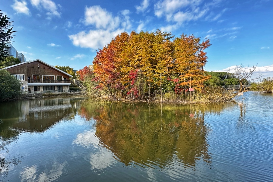 在宝山区炮台湾湿地公园红黄色的树木倒映在水面上,胜似画卷。