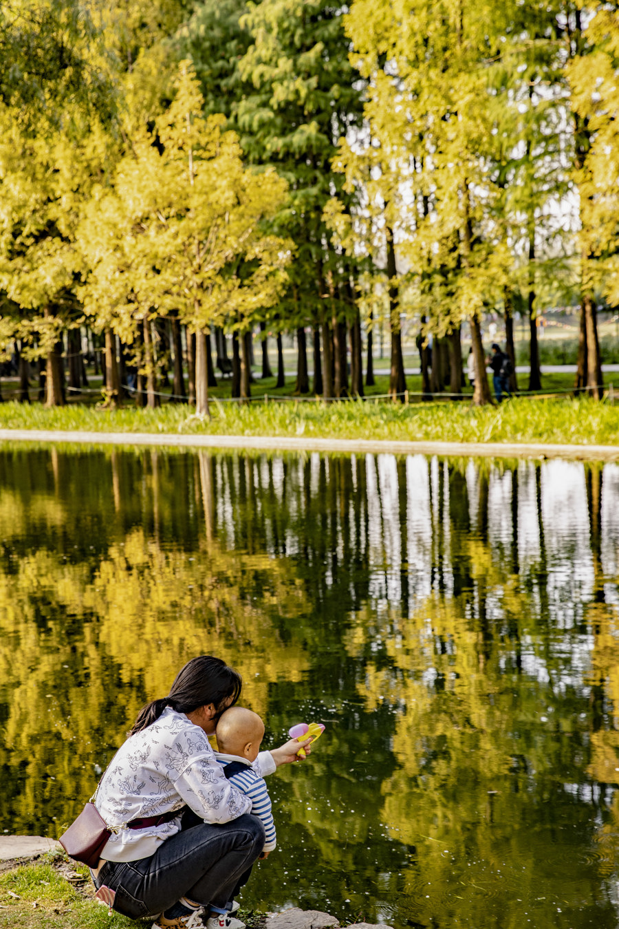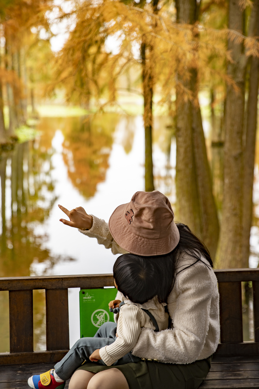 在青浦青西郊野公园,一位妈妈带孩子在欣赏秋色。