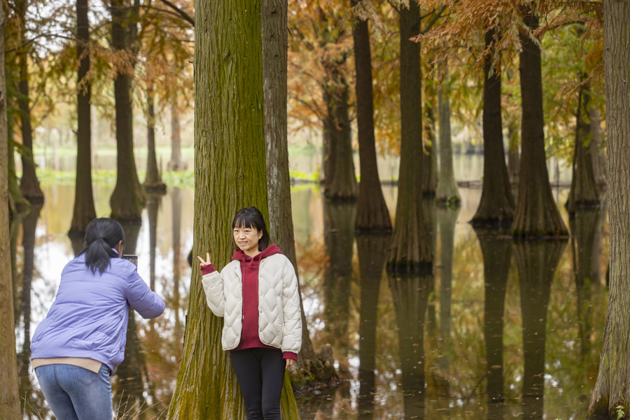游客在青浦青西郊野公园欣赏水上杉林秋色。