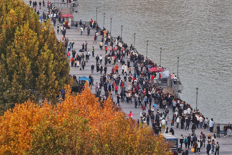 外滩的悬铃木叶子已经变黄,吸引不少市民游客前来赏景。