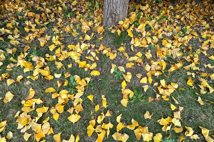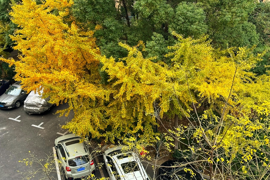 在闵行区一小区里,银杏树也换装变成了金黄色。