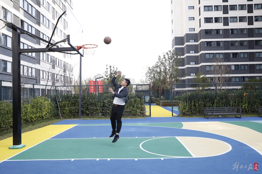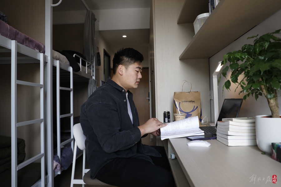 25岁的吴涛是安徽宿州人,来沪六年多。如今他在附近小区做“保安队长”(秩序主管),是有巢公寓“一张床”的受益者,每月500元住上大学宿舍一般的房间,让他十分高兴。休息时他喜欢读书,打篮球。