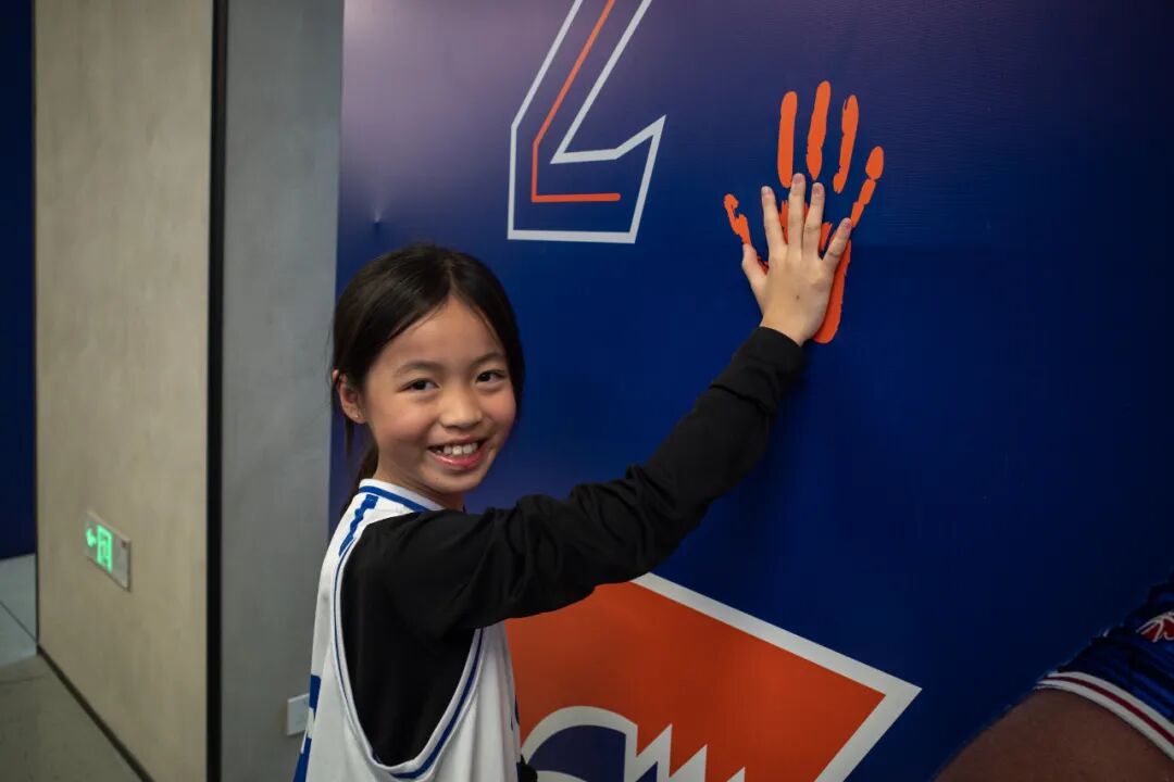 李指导摸摸Cora的头,欣然地在球衣上签名,还问起Cora训练的情况。爸爸说,一周训练三次,Cora补充道,“对,二四六”。李指导点着头,“参加集体项目很不错,比练个人项目好。”