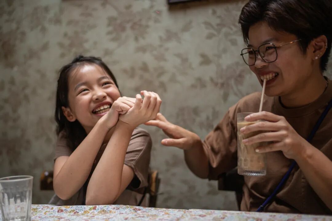 “哦哟,老克勒!”画外的妈妈哈哈大笑,一只手伸进画面,跟女儿互相击掌。