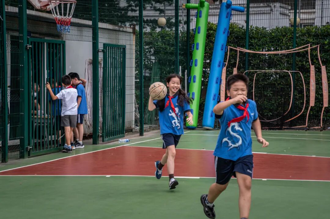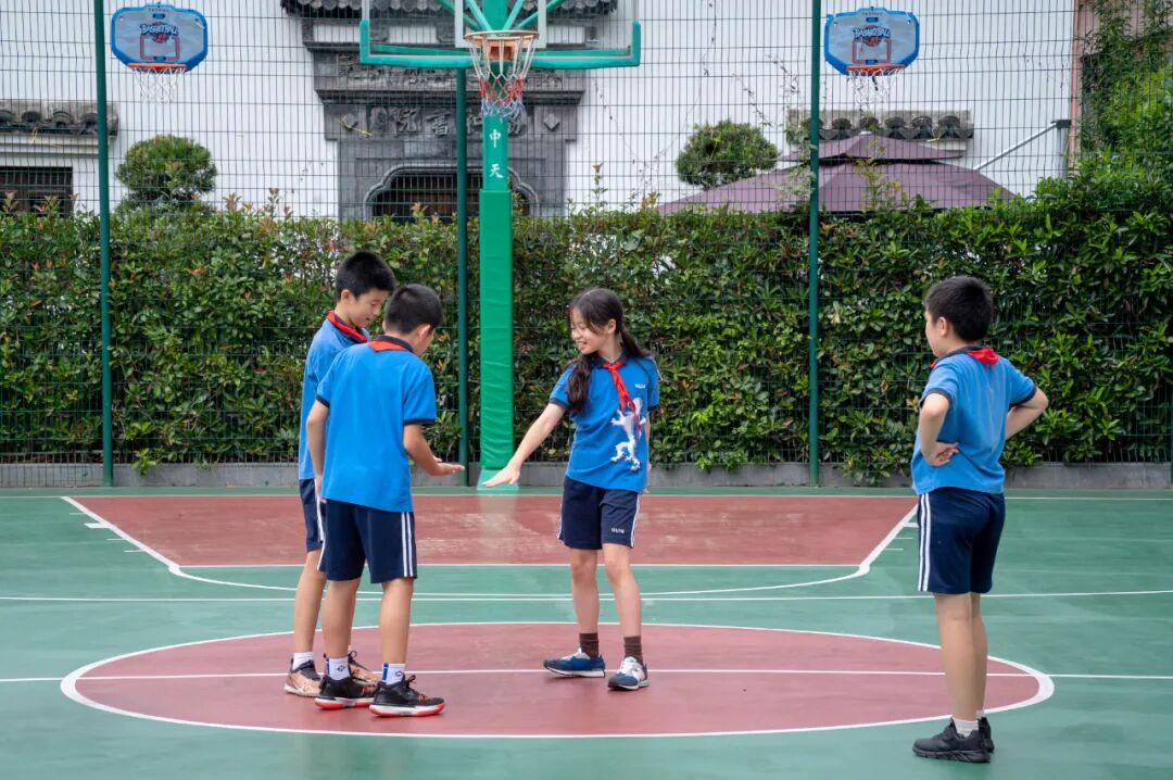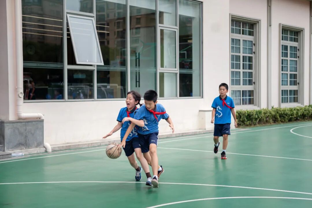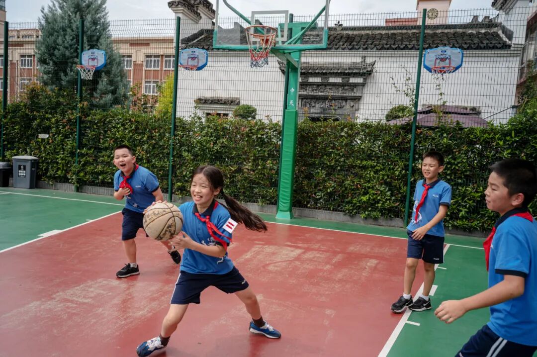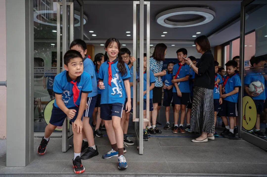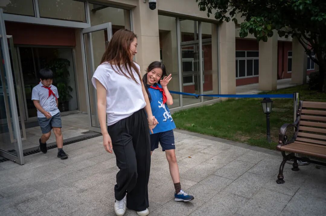 操场上一眼望去都是欢蹦乱跳的孩子,一年级的小朋友也挂着标识牌出来玩。刘老师回忆说,“Cora刚来时也是这么个小不点,还在换牙。”
