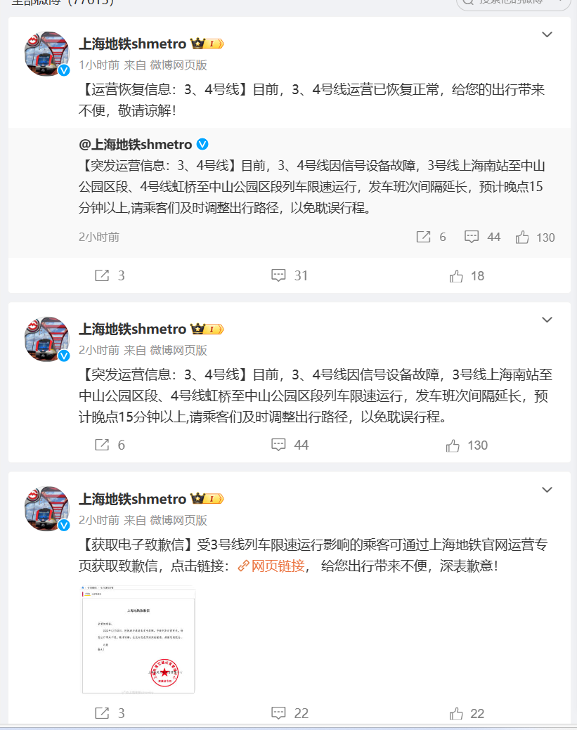 9时38分,上海地铁发布电子致歉信,受3号线列车限速运行影响的乘客可通过上海地铁官网运营专页获取致歉信。