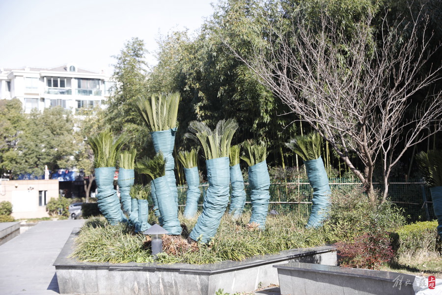 迎战寒潮——上海不少居住小区对亚热带树种给予“穿衣戴帽”的防寒保护。