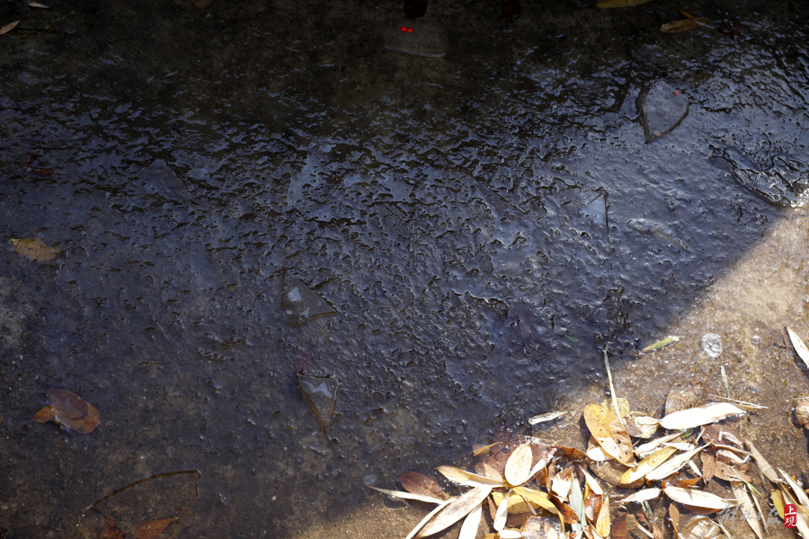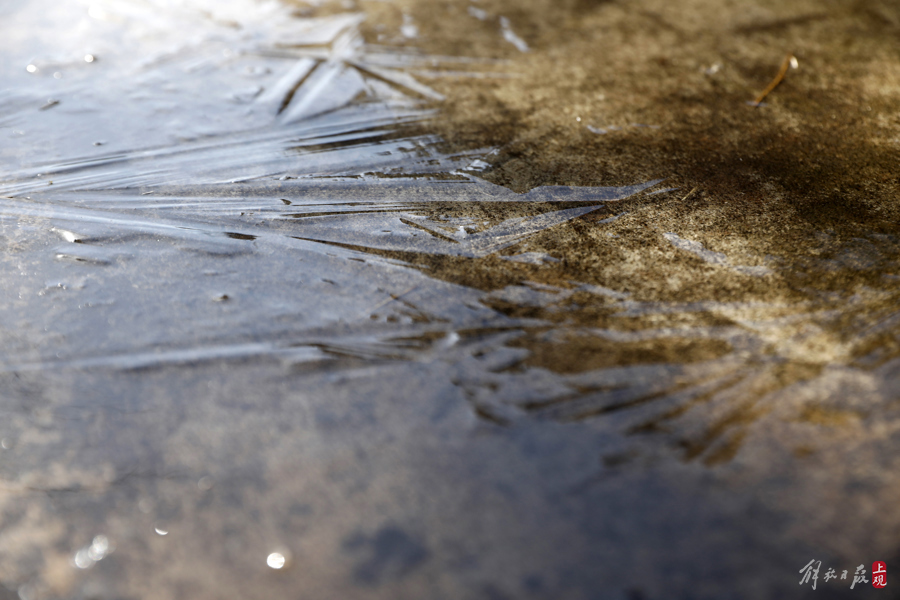 17日早晨,上海出现结冰——建筑背阴面的积水出现凝冻,直至中午才逐渐消融。