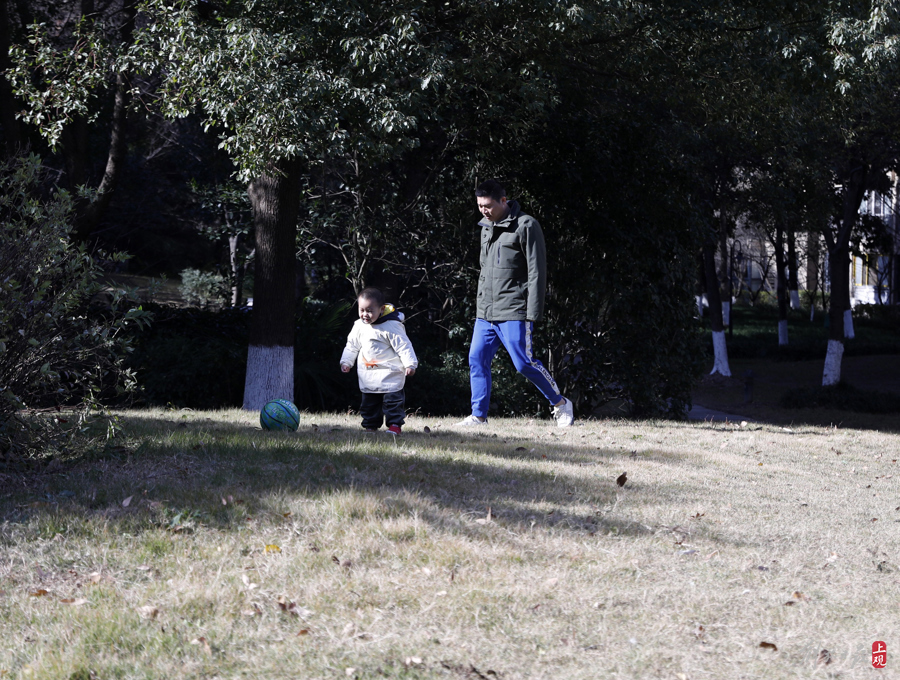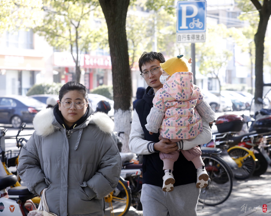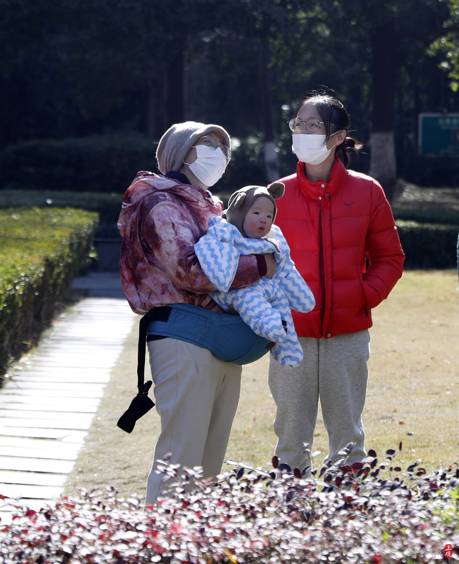 午间天气晴好,大人们带着孩子出来游玩晒太阳。