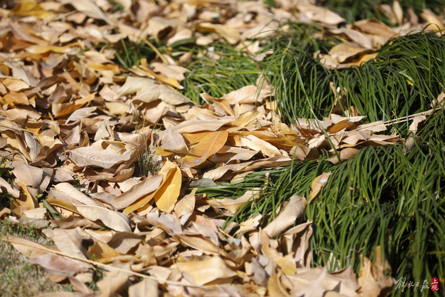 前两天大风降雨之后,一些落叶乔木被“剃头”,地面则堆积了大量落叶,成为一道美景。