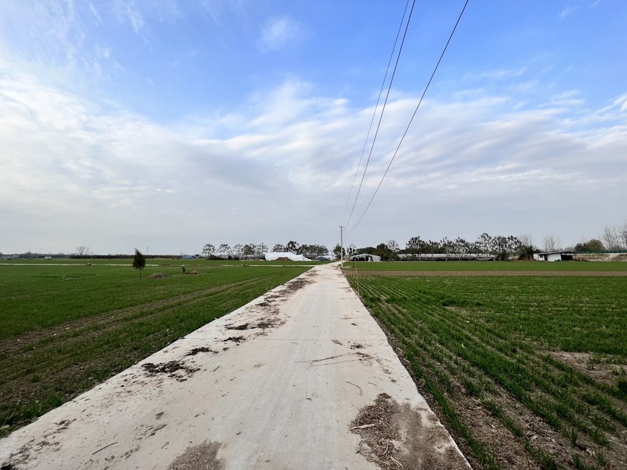 施工现场,正在修建的路段穿过了原本的农田。附近,一条小溪在枫杨树的包围下静静流淌,远处的土地清冷空旷。