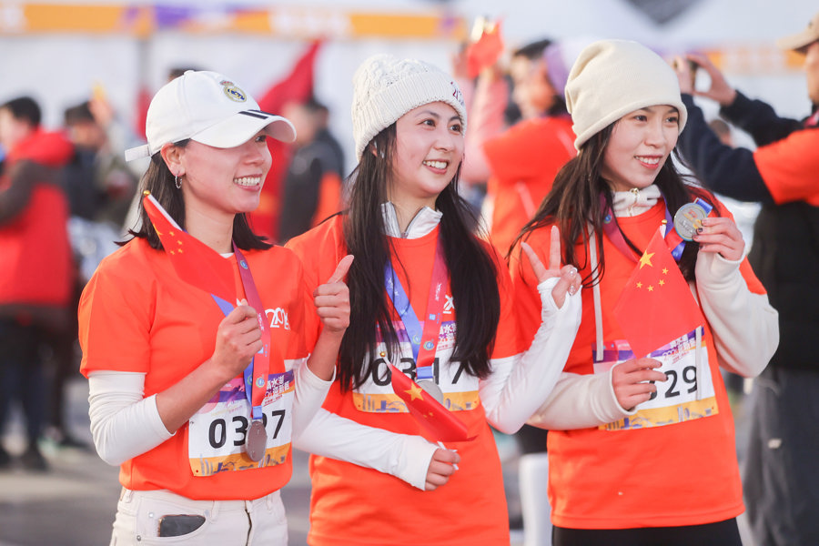 参赛选手拿着完赛奖牌拍照留影。